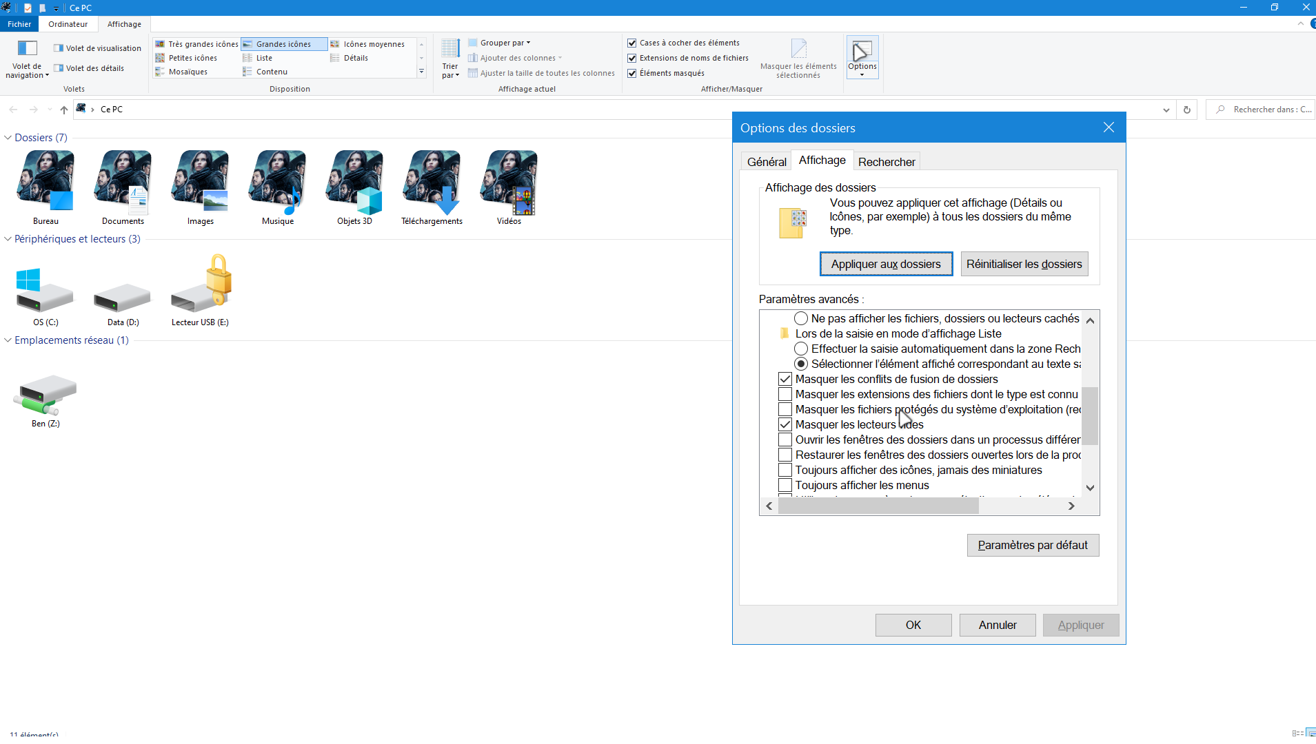 Si vous allez dans certains dossiers comme les documents par exemple ou le bureau, il se peut que vous trouviez certains dossiers comme celui des images ou autre qui ne sont pas modifiés. Pas de problème, nous allons les modifier un par un. Ouvrez-en un et recherchez le fichier desktop.ini. Pour le voir, il faut afficher les éléments cachés du système et fichiers protégés. Pour cela, allez dans l’onglet affichage de l’explorateur de fichier > options > affichage. Décochez Masquer les fichiers protégés du système d’exploitation comme ci-dessous.