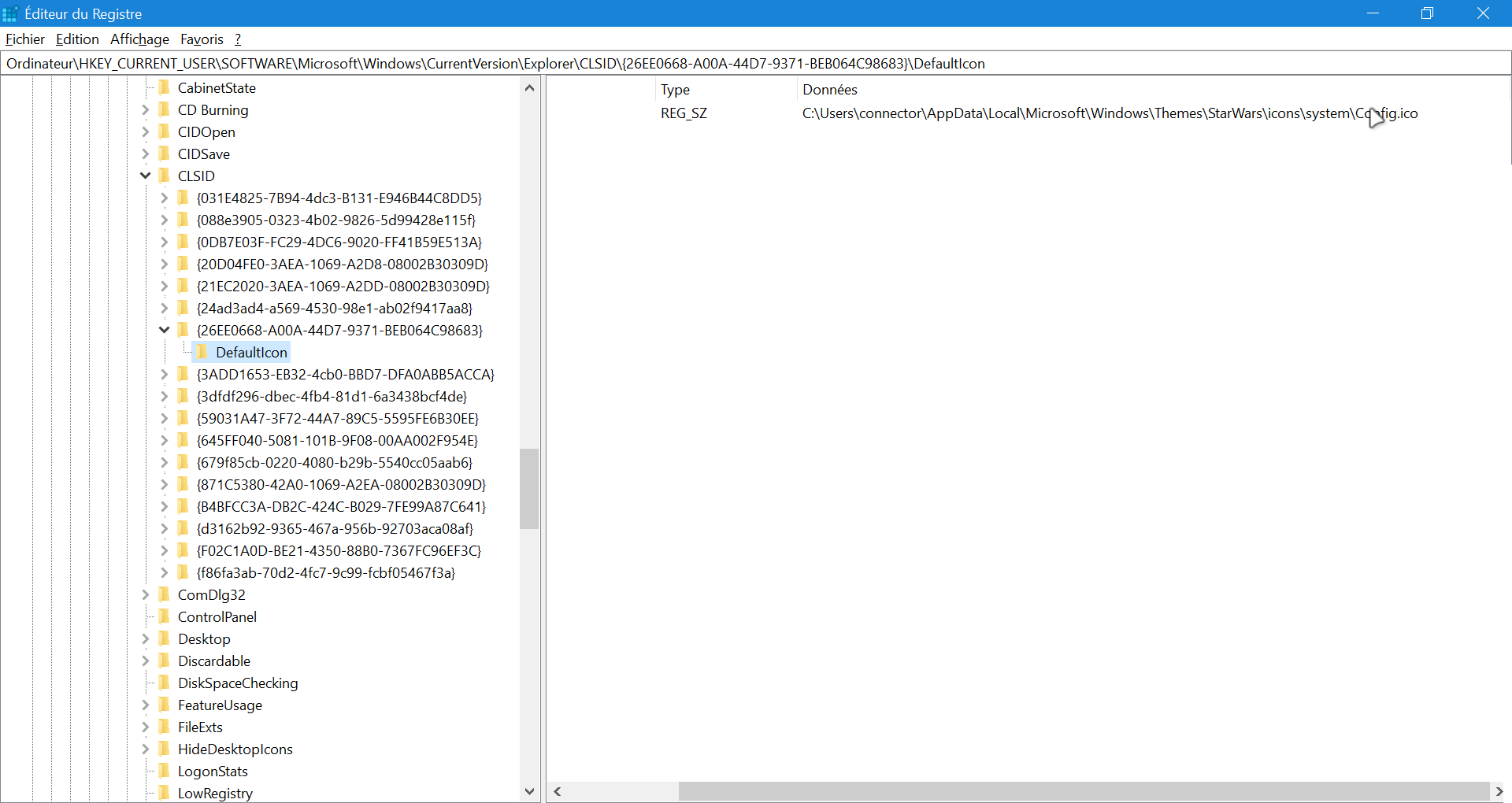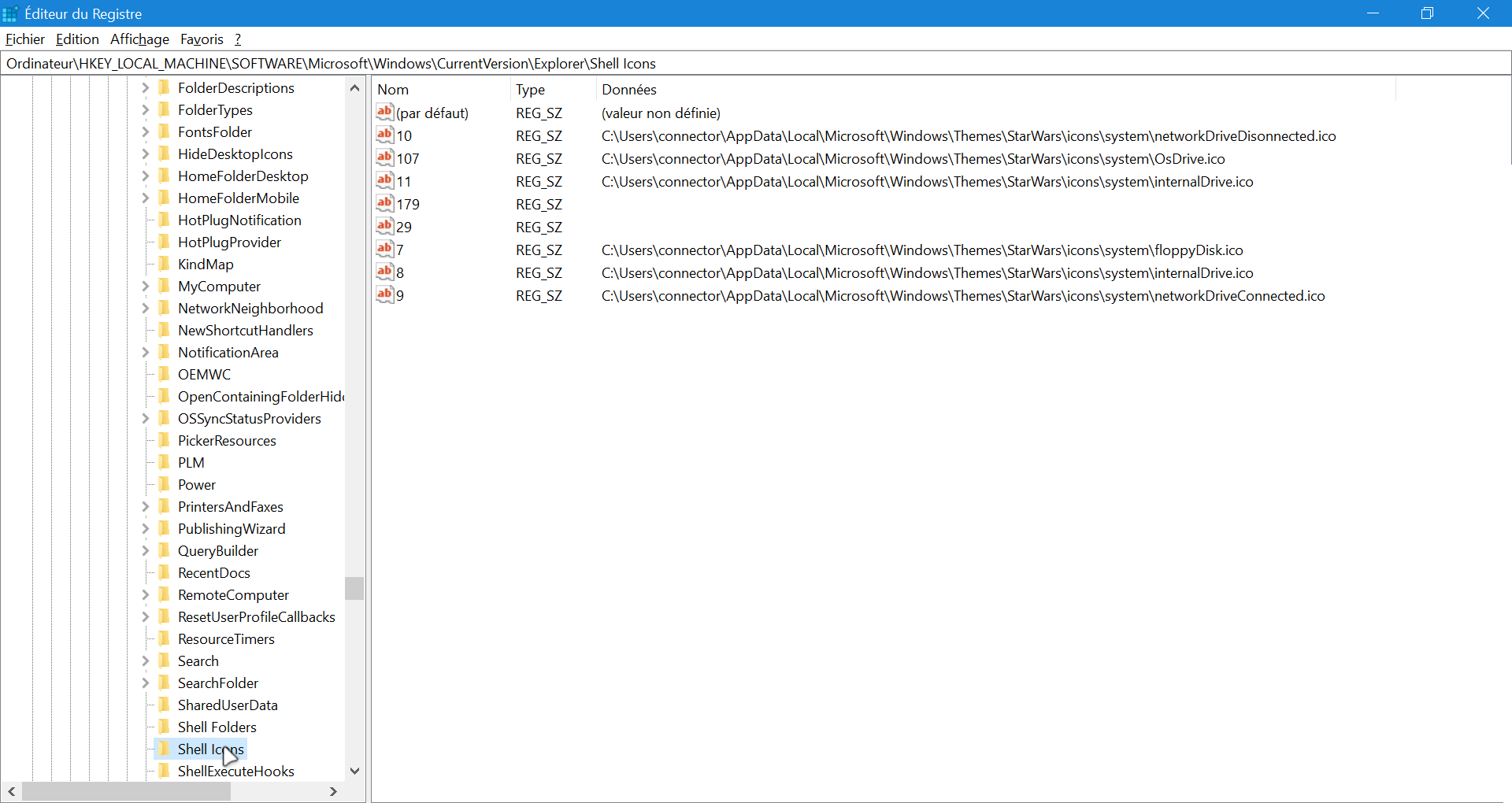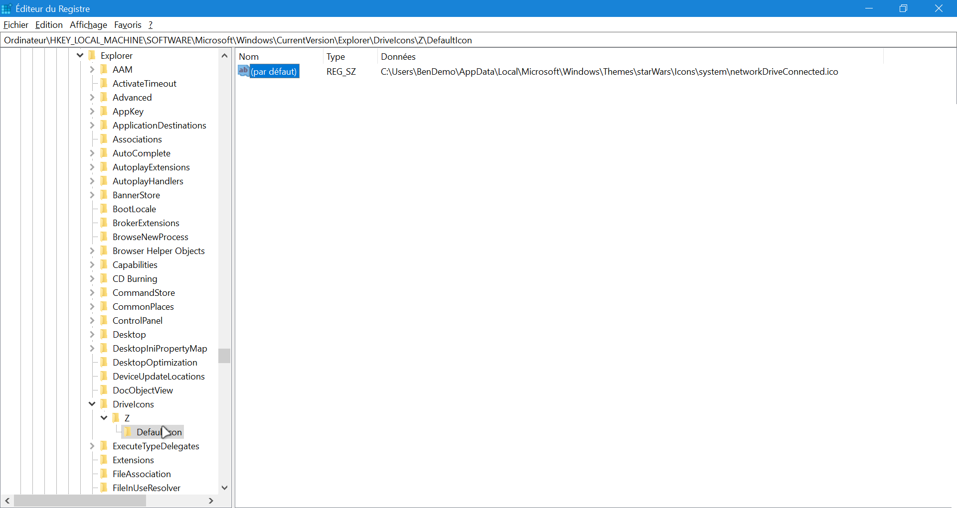 Petit aparté sur les chemins : depuis le début de cet article, tous les chemins que j’ai affichés commençaient par la variable d’environnement %LocalAppData%. Cela était bien car nous ne modifiions que des éléments de l’utilisateur courant. En revanche avec les icônes en dehors du fichier .theme cela ne sera pas toujours le cas. En fait dès que nous ne sommes plus dans la branche de registre débutant par HKEY_CURRENT_USER nous modifions les icônes pour tous les utilisateurs. Ce qui signifie que si vous mettez un chemin débutant par %LocalAppData% à partir de votre session pour modifier, par exemple, l’icône du lecteur C : et qu’un autre utilisateur se connecte à la sienne, il n’aura pas d’icône d’affichée. En effet, Windows interprétera le chemin comme celui de l’utilisateur en cours. Et comme l’icône se trouve dans votre session, elle ne s’affiche pas. Pour pallier ce problème, nous devrons indiquer le chemin absolu. Dans mon cas :