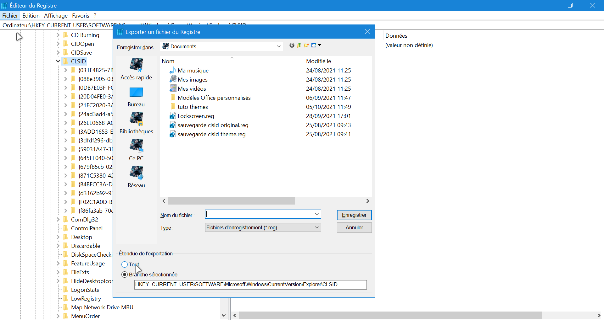Vous trouverez sur internet des listes de clés CLSID. Cependant, vous verrez parfois plusieurs clés pour le même objet, il convient alors de faire des essais pour voir laquelle correspond à votre système. Par exemple, pour les documents j’ai trouvé deux clés, mais aucune ne fonctionnait. Je suis allé faire une recherche dans le registre à partir du fichier de l’icône correspondant. J’ai fini par trouver celle affichée plus haut. Et cela fonctionne !